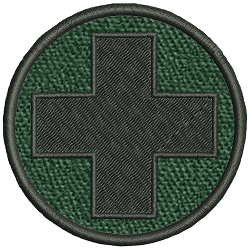 Tygmärke Sjukvård med värmeklister. Svart broderat kors på grön botten och med svart broderad kant. Värmeklisterbaksida vilket innebär att märket kan värmas på med hjälp av strykjärn alternativt sys fast.
